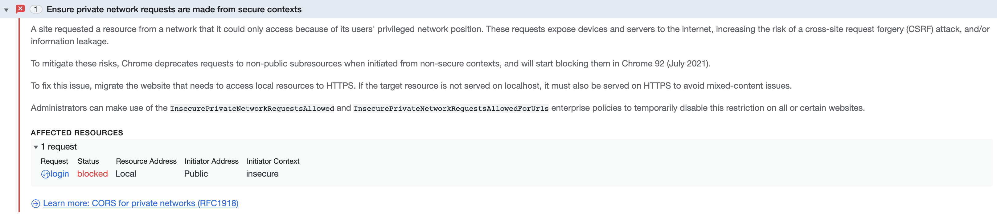 (Ensure private network requests are made from secure contexts,其实就是让你把服务改成https的)