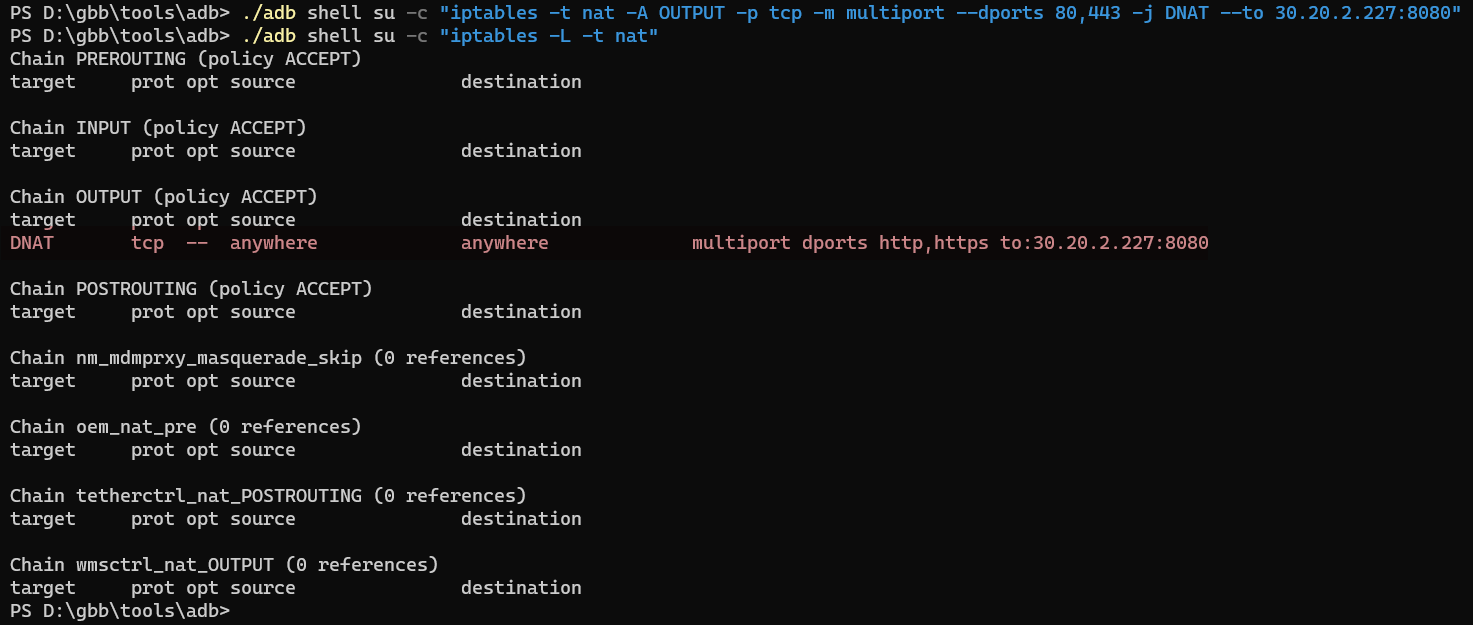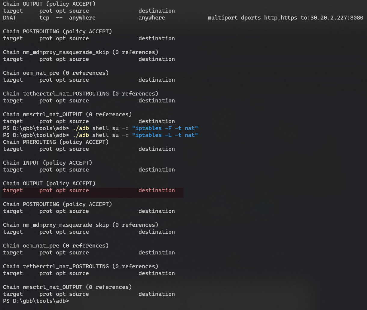 adb shell su -c "iptables -t nat -F"可以看到规则成功删除。