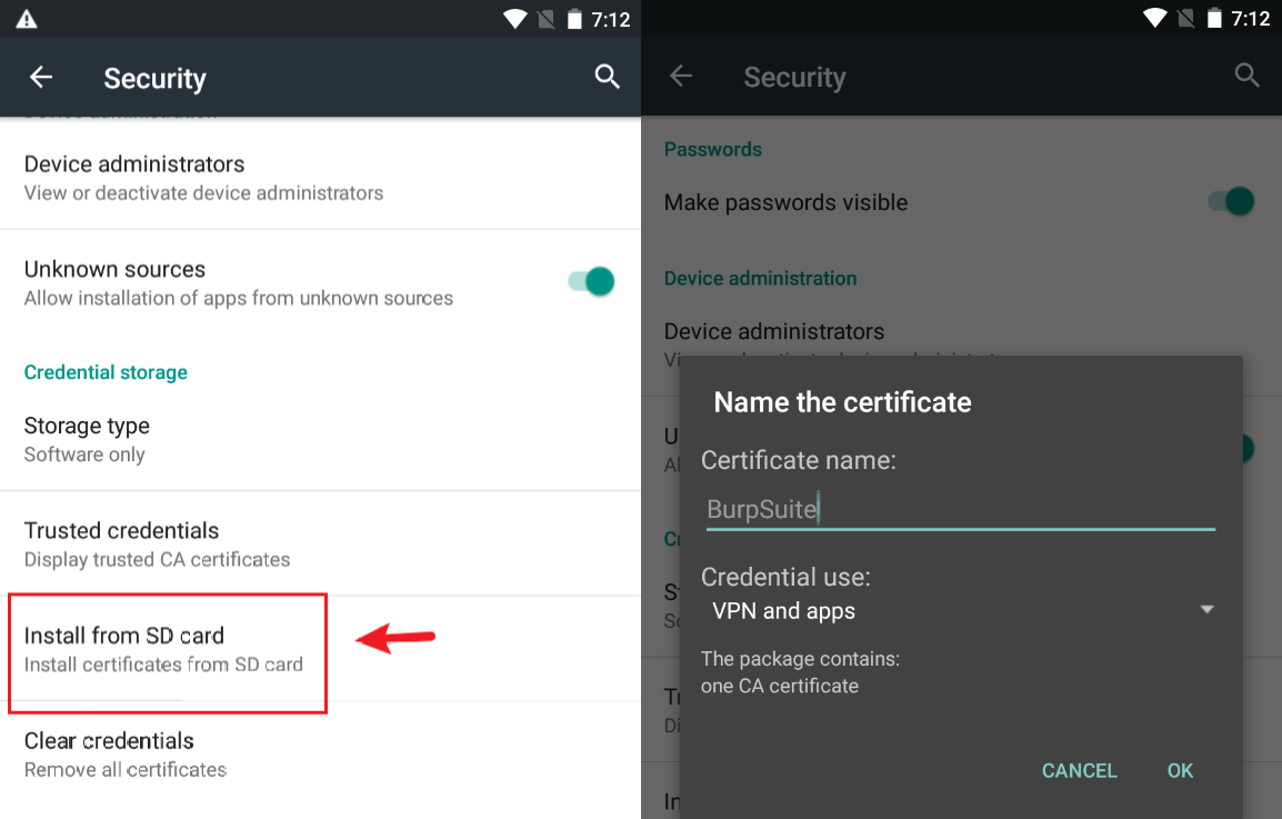 Warning: 计算证书 hash 用 -subject_hash_old 选项 而不是 -subject_hash(等同于 -hash )选项,因为 -subject_hash 使用 SHA-1 算法,-subject_hash_old 使用 OpenSSL 1.0.0 之前老算法 MD5 计算。经过测试在 Android 7 64bit 上只能使用 -subject_hash_old 系统才能识别出证书。