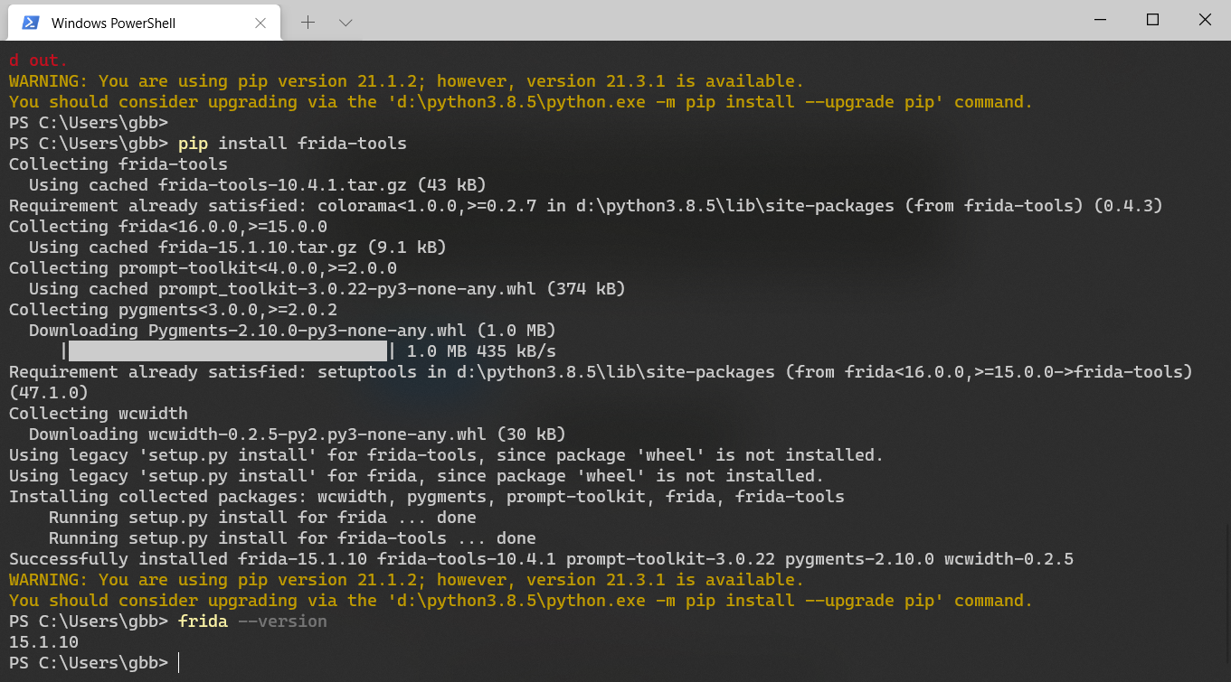先安装 Python3,运行 pip install frida-tools 安装客户端。