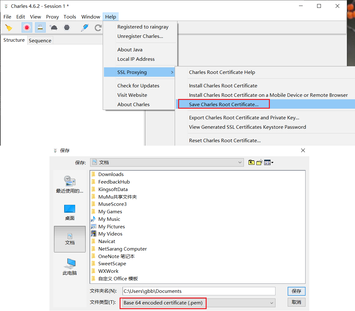 Charles 手动安装证书,前面提到过 Android 7.0 用户证书不再有用,所以需要 root 安装系统证书。通过 Charles“Help -> SSL Proxying -> Save Charles Root Certificatee”选择保存 .pem 证书。