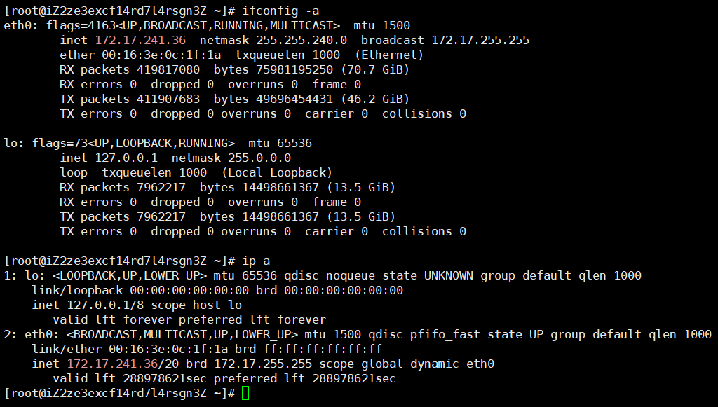 Mac OS X 和其他类 Unix 系统,运行 ifconfig -a 或者 ip a 获取地址,下图以 CentOS 为例。