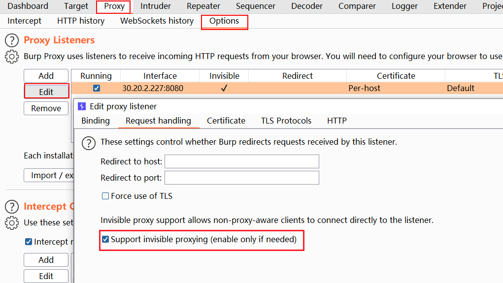 随后打开 BurpSuite 开启透明代理“Porxy -> Options -> Edit -> Request handing -> Support invisible proxying(enable only if need)”即可抓包。
