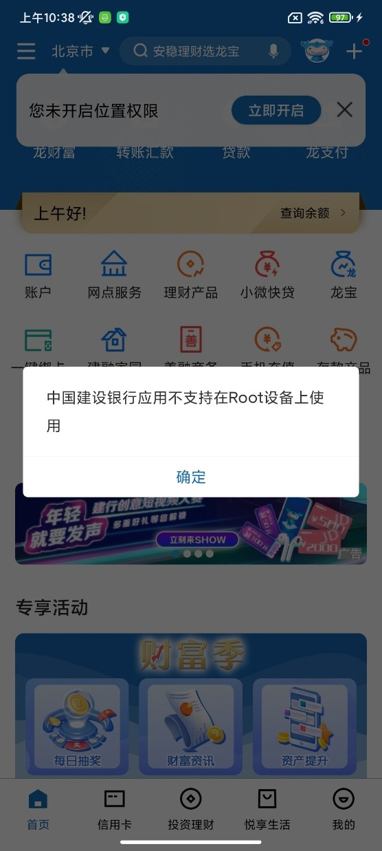 通常四大行 App 会检查 ROOT,以中国建设银行为例,系统 ROOT 后无法打开应用,点击确认后应用退出。