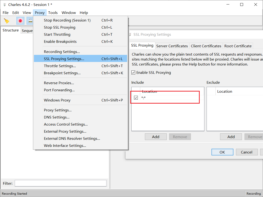 证书、代理设置完之后,需要配置 SSL 代理,这样 Charles 才会记录 HTTPS 请求而不是直接转发发给服务器,换句话说是开启 SSL 代理 HTTPS 才能显示明文,这里设置为通配符表示任意站点任意端口。