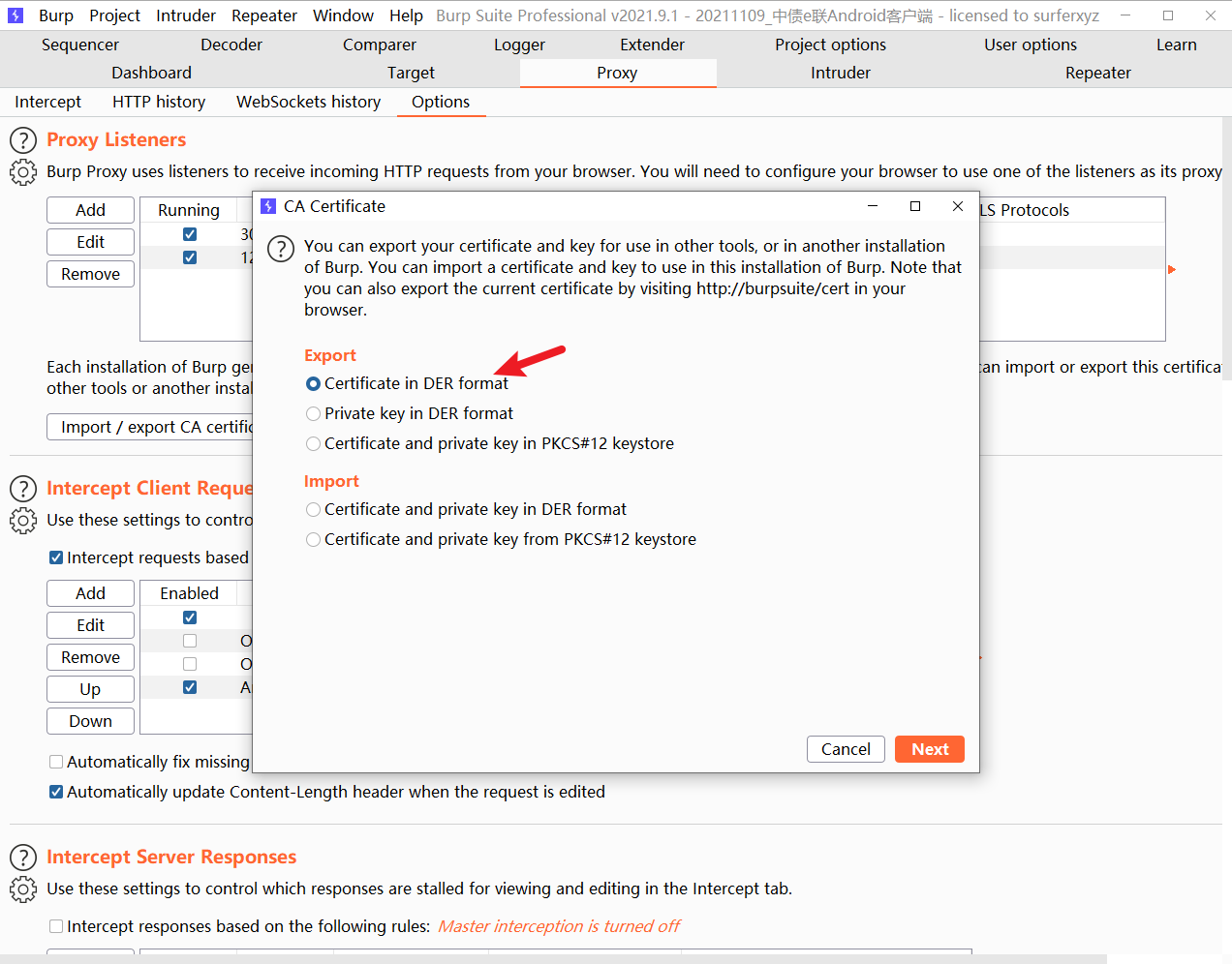 安装证书得首先拿到公钥证书,打开 BurpSuite 找到“Proxy -> Options -> Porxy Listeners”功能,点击 import/export CA certificate 按钮导出,文件后缀改为 .crt 或 .der 方便系统识别。