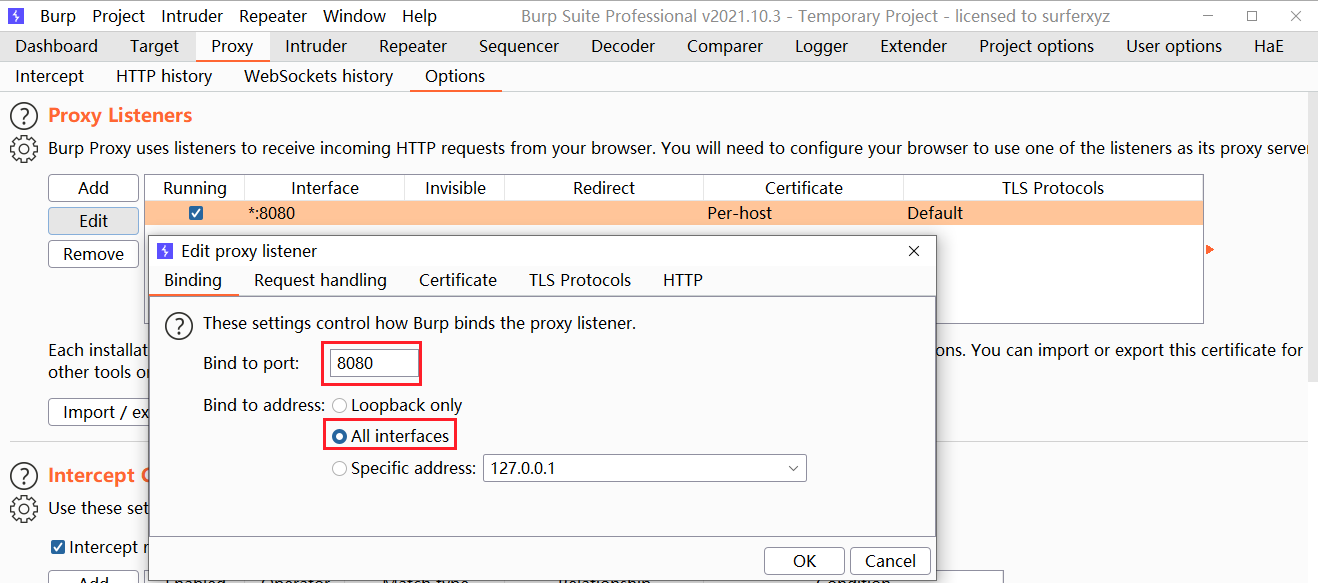 BurpSuite 先设置好监听地址和端口,地址实际是你正在上网的网卡地址,这里我选择 All interfaces 去监听所有网卡。
