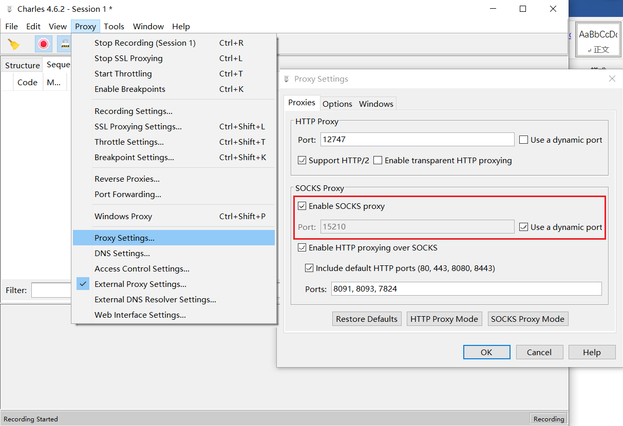 下一步设置 Charles 监听 Socks 端口,手动指定怕端口冲突勾上“Use a dynamic port”让 Charles 自动选,这两种方式都行。