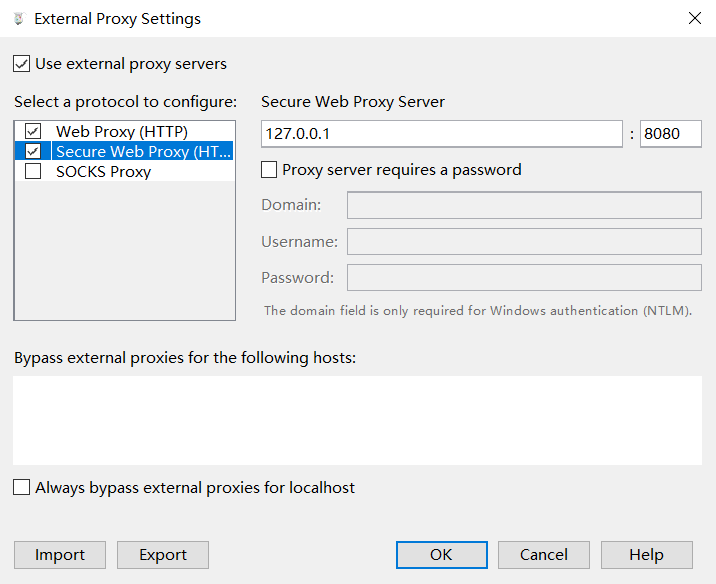 勾上 Use external proxy servers 启用功能,选择 HTTP、HTTPS 请求转发到 BurpSuite 监听的地址 127.0.0.1:8080——实际地址和端口根据个人设置更改。