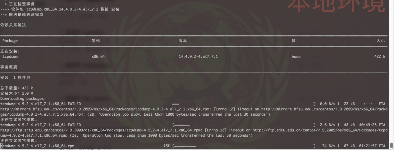 在进程安装tcpdump的时候发现下载慢的一批就开始怀疑大概率是机房问题了(甚至很多时间直接timeout 因为 yum 有slow down 机制)。