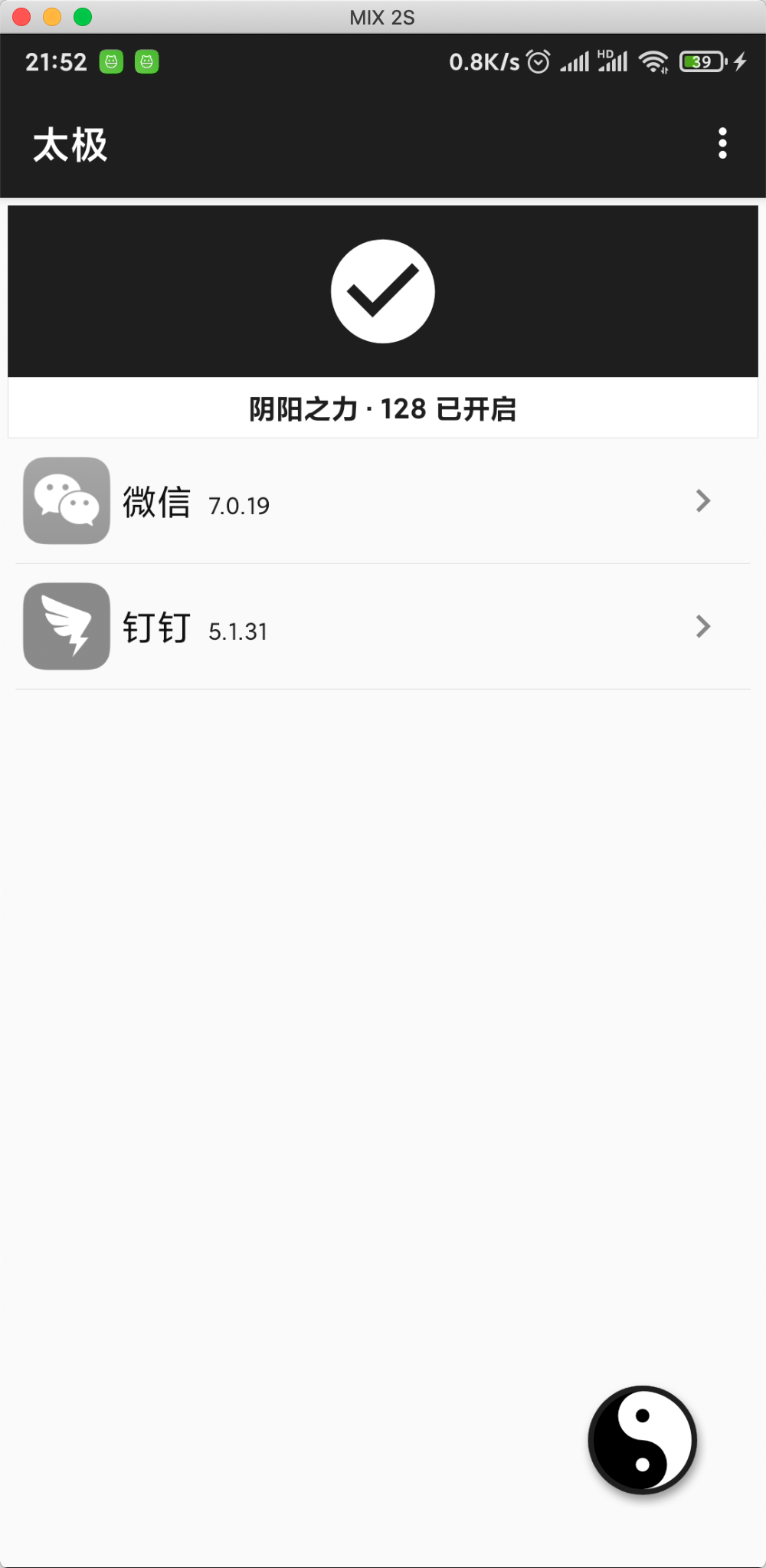 安装好太极App默认是阴模式,阳模式要足够的权限才能开启。